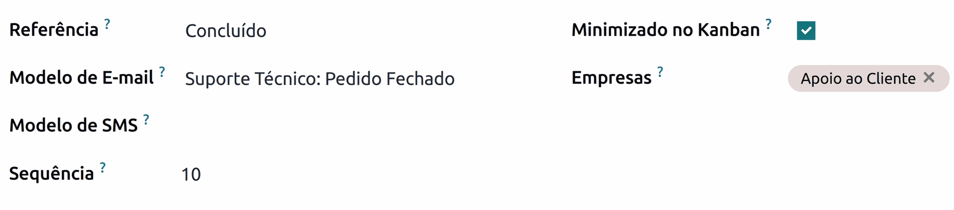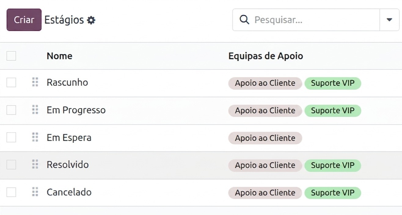 Nos aplicativos, esses cartões representam itens específicos; por exemplo, no aplicativo Helpdesk , os estágios rastreiam os chamados. Os estágios são personalizáveis e podem ser renomeados para atender às necessidades de cada equipe.