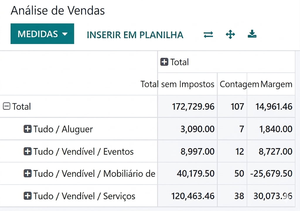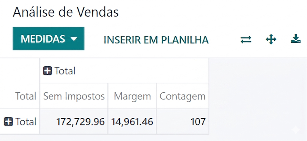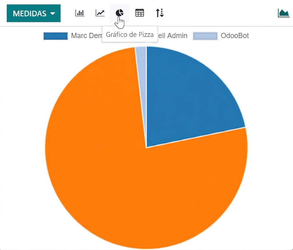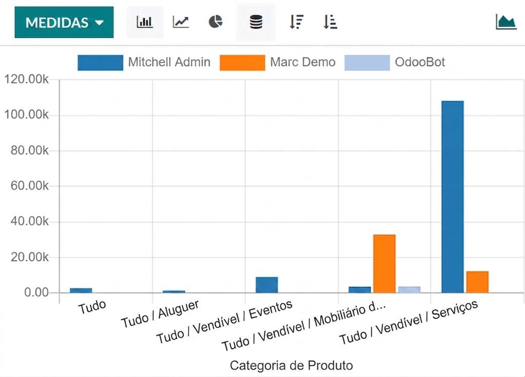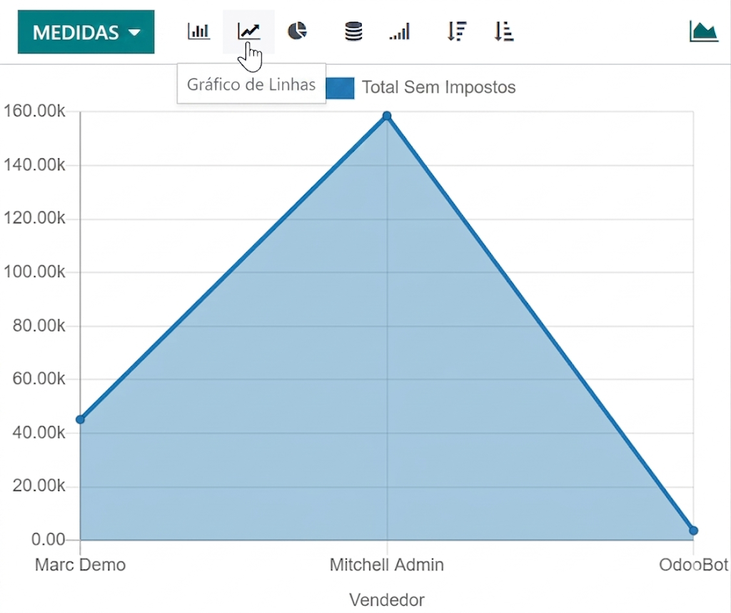 Dependendo do relatório, o Odoo pode exibir os dados de várias maneiras. Às vezes, há uma visualização exclusiva totalmente adaptada ao relatório disponível, enquanto diversas visualizações estão disponíveis para outros. No entanto, duas visualizações genéricas são dedicadas a relatórios: as visualizações de gráfico e pivô.